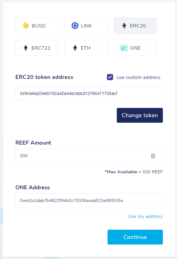 Let’s say I want to move 500 REEF tokens from my Ethereum wallet onto the Harmony chain. REEF isn’t one of the pre-configured tokens, so we select ERC20 and enter a custom address. When the Change token button is pressed, the token is recognized, and the prompts & available quantity will be changed & populated accordingly.